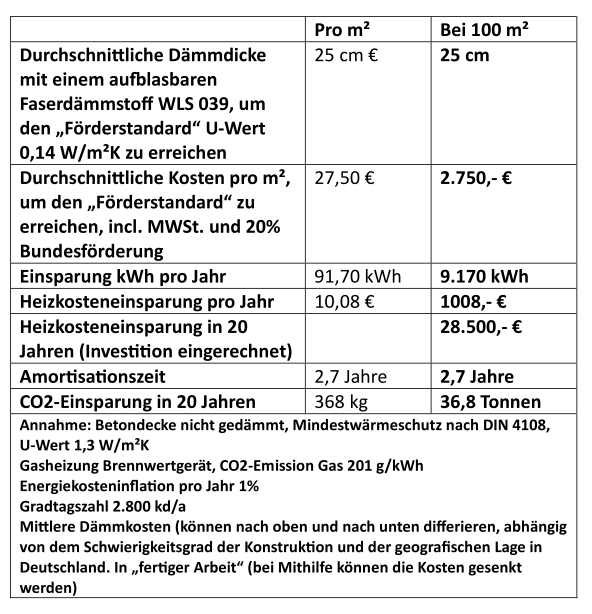 Kosten/Wirtschaftlichkeit: Abhängig vom Schwierigkeitsgrad und Objektgröße kann die Maßnahme bei 30 - 40 cm Dämmdicke bis zu 40 € pro m² kosten. Der Wärmeschutz kann um bis zu 95% (je nach Anfangssituation) verbessert werden. Die Maßnahme amortisiert sich in einem Zeitraum von unter 4 Jahren.