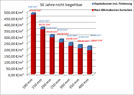 (Annahmen: Dämmstoffkosten "in fertiger Arbeit" 90,- € pro m³. Wärmepreis 0,13 €/kWh, Energiepreissteigerung 3%/a)